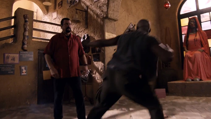 I’ll grant first-time director Tan Bing this: he doesn’t screw around. Mike Tyson and Steven Seagal have a knockdown, drag-out superhero style bar brawl in the first five minutes. So no complaints here. Like I said, Mike Tyson is some sort of super-spy. He’s trying to destroy the African nation’s communications system to stop the war, I think. But both he and the unnamed African nation are strict Muslims so he’s offended when he goes undercover and the other shady guys he’s investigating insist he has a drink in good faith. Then they try to force Iron Mike to drink pee. Oh no they didn’t. Tyson, naturally enough, refuses and beats the crap out of the entire bar. He’s a fighting machine who moves blindingly fast, shakes off an oak barrel to the head, and punches holes in the walls and furniture. Seagal is his typical fat, bloated self, but at least he’s really there doing martial arts, unlike in most of his movies where he’s extensively stunt-doubled and frequently doesn’t get out of his chair. Their fight is something out of a teenage boy’s fever dream. Wouldn’t it be cool if these two personalities had an imaginary fight in a movie? Long story short, they both are edited to be hyper-fast and super-awesome at fighting. They go crashing through balsa wood tables and scenery. And Mike Tyson kicks Seagal’s smarmy, lard-ass.